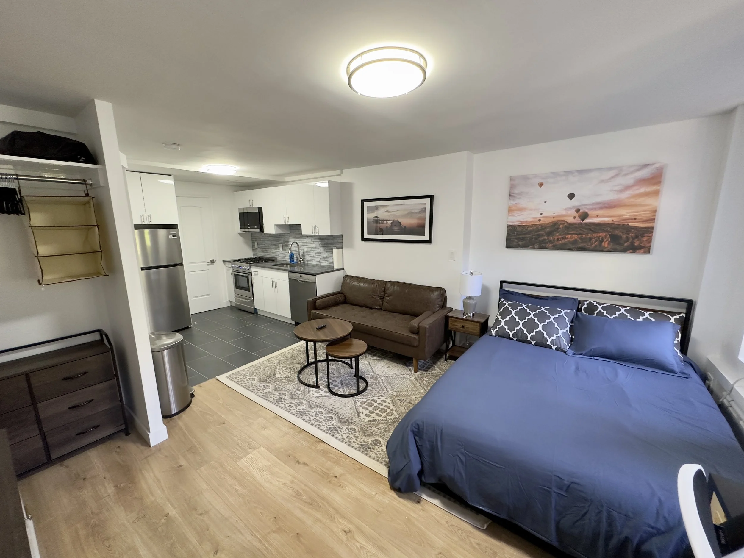 Our apartments come with all the essentials, such as cookware, kitchenware, linens, towels, heating, A/C, etc. All of our apartment have super comfy memory foam mattresses, a dedicated workspace with large external monitors to do any work from home. All utilities and high-speed Wi-Fi are included with each rental.